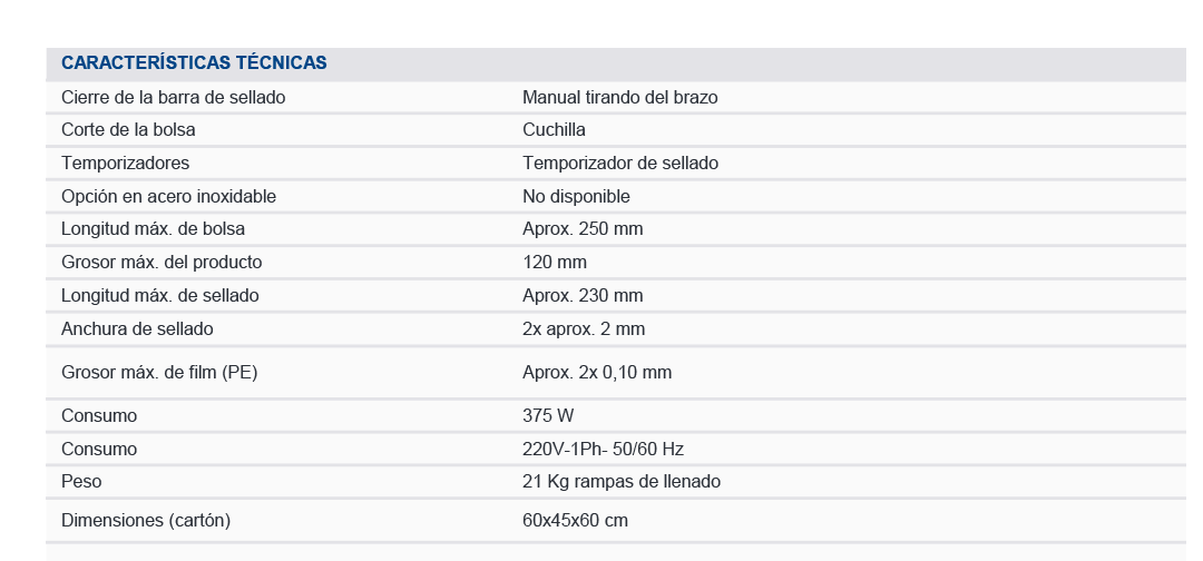 La Speedpack es una envasadora y selladora manual que funciona con tubo de polietileno enrollado en el canal de llenado. Al insertar los productos por el canal, el producto desciende por su propio peso, arrastrando el material tubular consigo. Una vez que el producto ha llegado al fondo de la bolsa, se puede iniciar el ciclo de sellado bajando el brazo de la máquina. El tiempo de sellado se regula con un temporizador. Un piloto luminoso se enciende mientras dura el impulso de calor programado.
