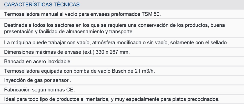 Termoselladora manual al vacío (o sin vacío) con envases preformados. Económica e ideal para pequeñas producciones con posibilidad de un cambio de molde constante. Envasado con atmósfera modificada, para conseguir una mayor conservación, una mejor presentación, así como facilitar el almacenamiento y el transporte.